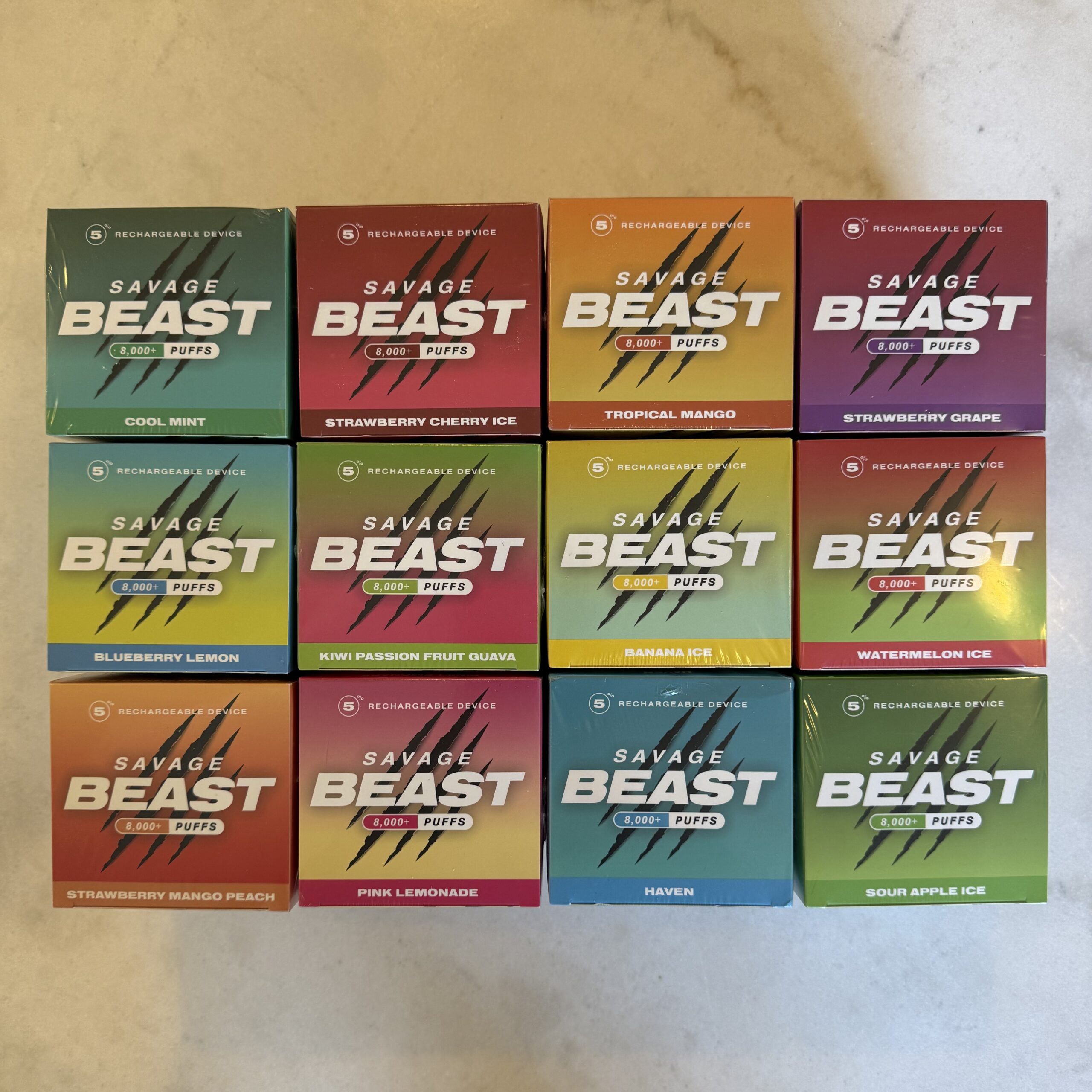 | Flavour | Cool Mint, Banana Ice, Blue Raz Peach, Blueberry Lemon, Haven, Pink Lemonade, Rainbow Candy, Sour Apple Ice, Strawberry Cherry Ice, Strawberry Mango Peach, Summer Berries, Tropical Mango, Watermelon Strawberry, Kiwi Passion Fruit Guava |