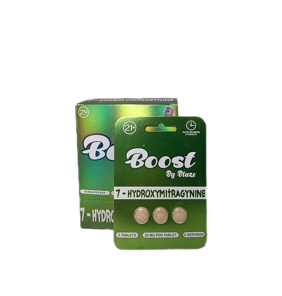 Boost by Blaze Green is a 7-Hydroxymitagine Kratom Supplement. 7-hydroxymitagine is an alkaloid that is derived from the Kratom plant, and has been clinically proven to connect to several different sectors of the brain. Including the opioid receptors of the brain! 47% of users of 7-Hydroxy use it for pain management, while 42% use it for mental well being.