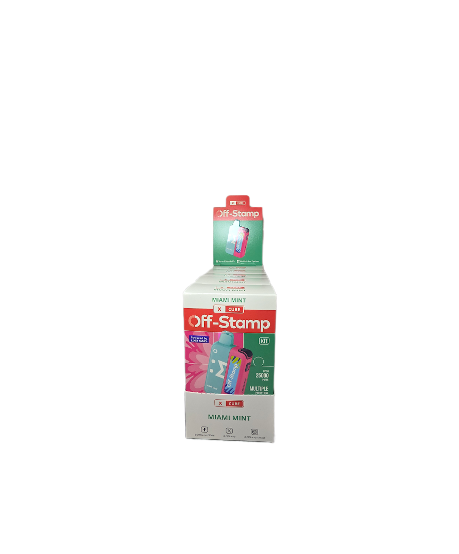Off Stamp is an up and coming brand featuring a removable battery and pod system. The 25,000 variety is the first in the Off Stamp line to feature a battery with a full digital display. On the display it shows the power level, remaining battery, and remaining juice.